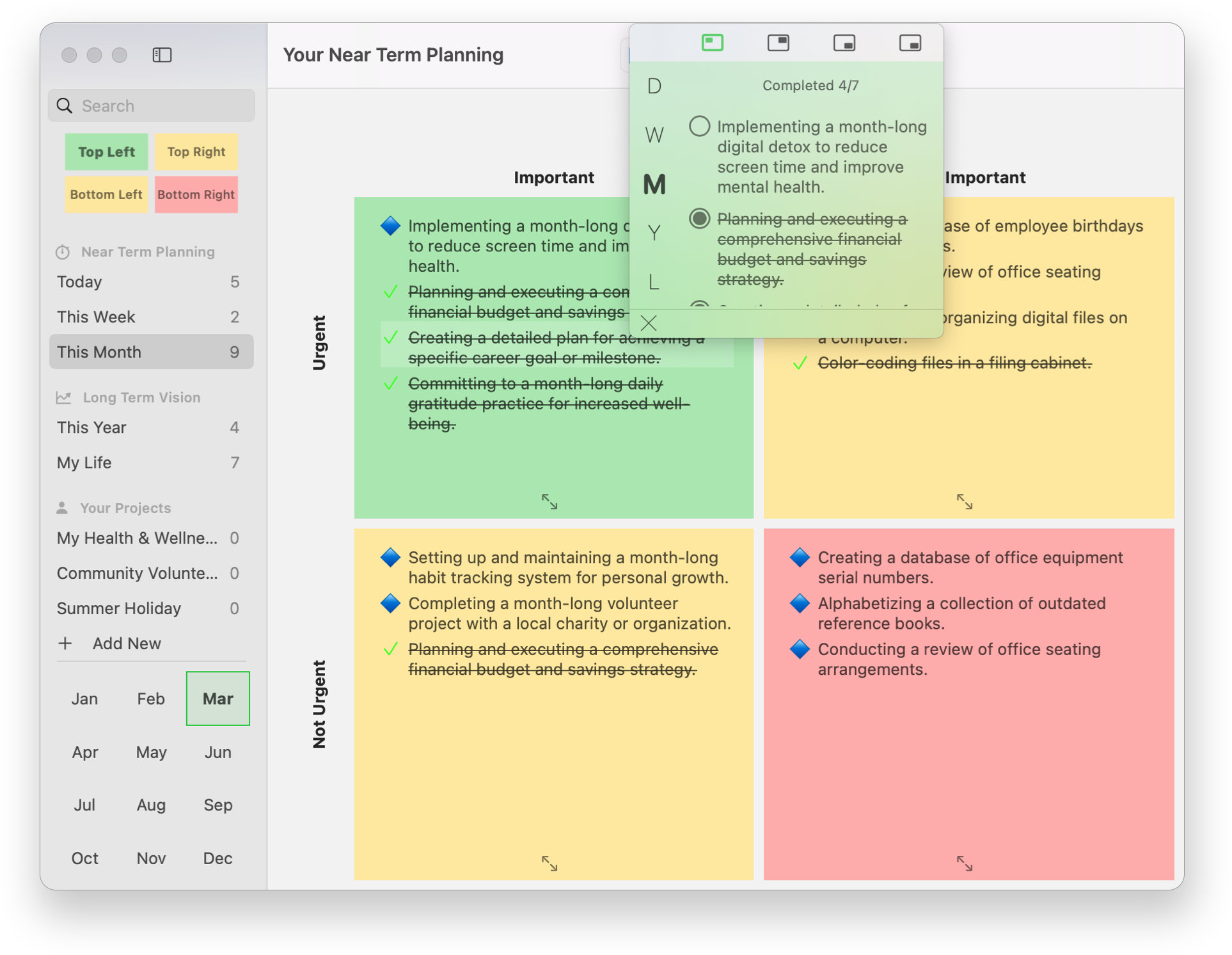 Easily access your tasks for all periods and quadrants right in the menubar. Glance, swipe, and browse with ease in the menubar's stunning UI.