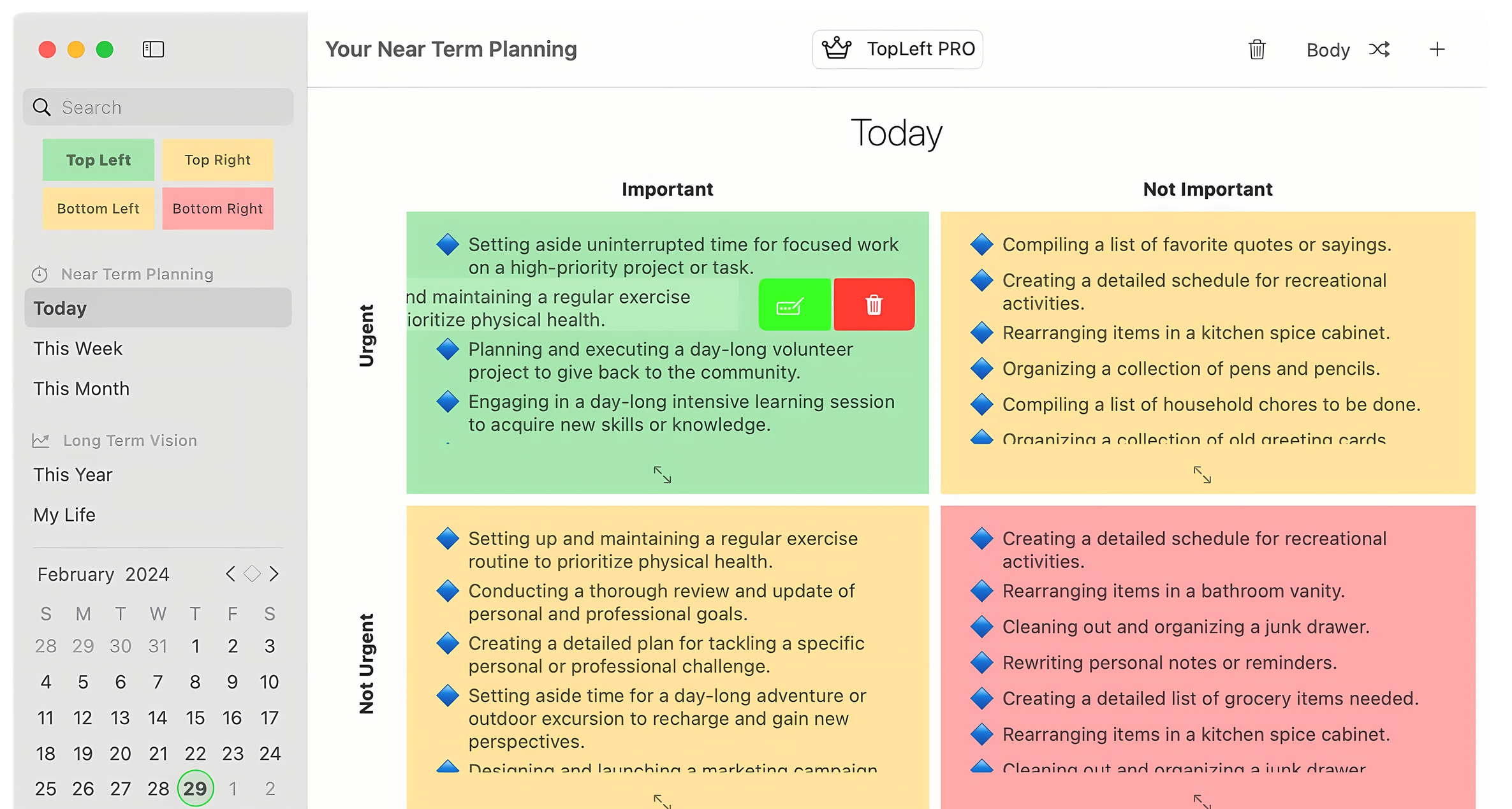 TopLeft helps you arrive at your 'Top-Left' quadrant. Your most important and most urgent tasks. Your other lower priority task shifted into the other quandrants.